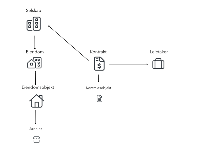 Kontrakt: Kontrakten er det som knytter sammen Selskap (utleier), Leietaker og Eiendom. Den inneholder alle overordnede detaljer som signeringsdato, løpetid, oppsigelsestid og kontraktsansvarlig.